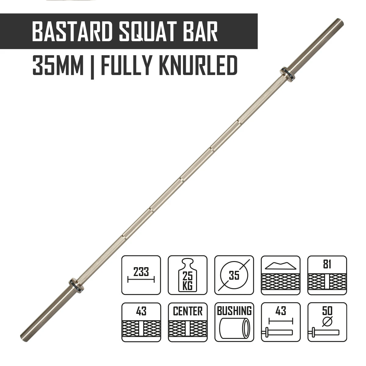 Our classic Bastard Squat Bar gets company. A thick shaft of 35mm spreads the pressure and the weight of the heavy loaded bar more comfortably through the back. The bigger diameter also decreases whip and the flexibility of the bar shaft, for it to be a relatively stiff bar, compared to weightlifting barbells.