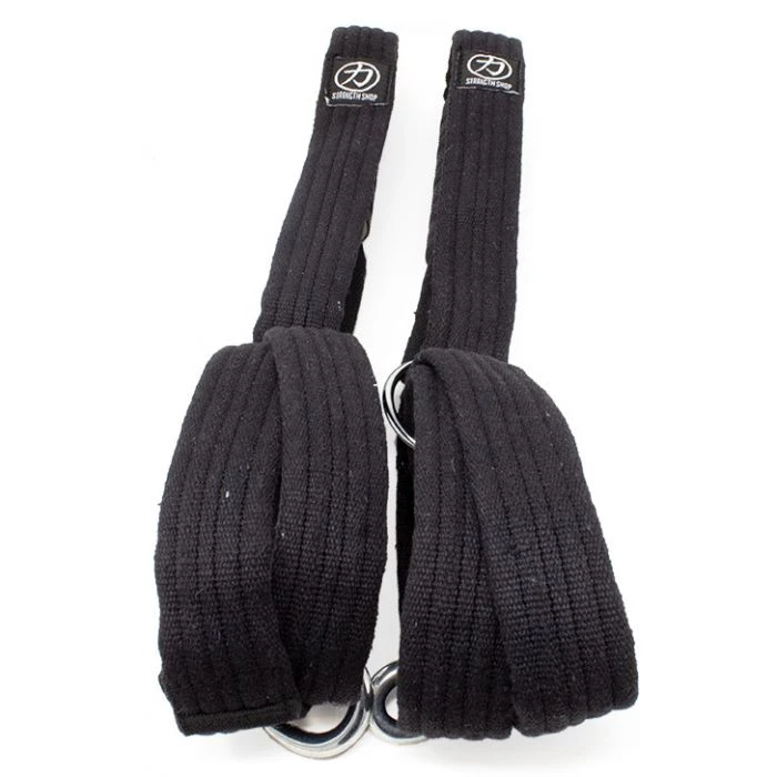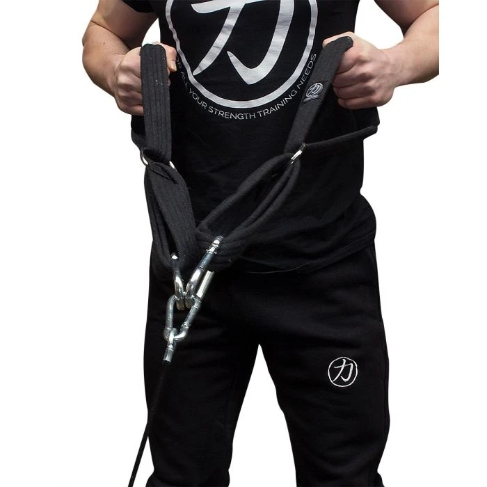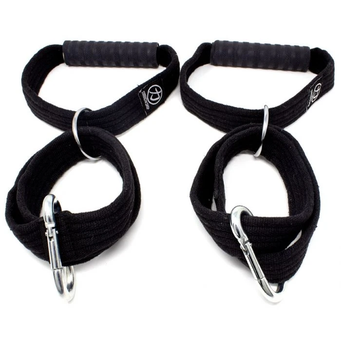 Each cable handle is made of two loops from extra strong and tightly woven cotton fabric, connected with a steel ring. They feature a reinforced handle with a soft grip surface for comfort and stability. Having two loops means they can rotate with each other, to allow you to pull at different angles to hit different muscles. They’re great for attaching them to a cable machine or to slings for dragging sleds. They come in a classic black colour way.