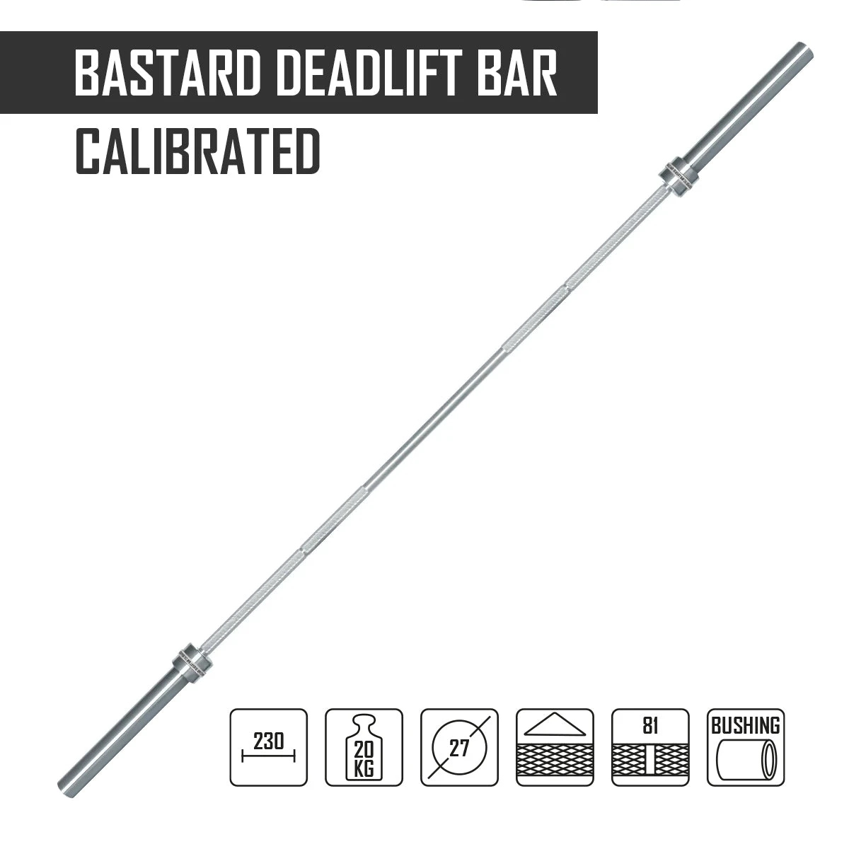The bar features three solid bronze bushings per sleeve, providing durability and reducing the need for maintenance. Measuring 27mm in shaft diameter and 2.3m in total length, its sprung steel shaft offers a significant amount of flexibility. Its sharp knurling, and the absence of a centre knurling, make it perfect for deadlifts. The powerlifting grip marking at 81cm lets you switch between bars and always get your individual setup right.
