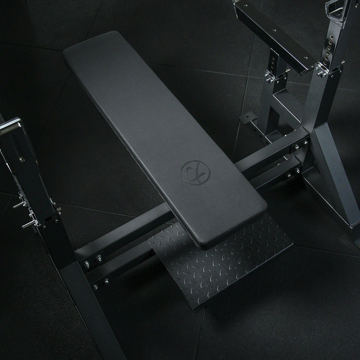UHMW plates, mounted to the uprights, protect and guide the uprights. The bar holder as well as the safety catchers have UHMW plates for protection too. A 15mm thick bar holder, 7.5mm thick bar holder with addition of a 7.5mm thick reinforced backing plate, will withstand even the heaviest reracks. A good amount of grip from the new bench pad offers a solid and firm setup.