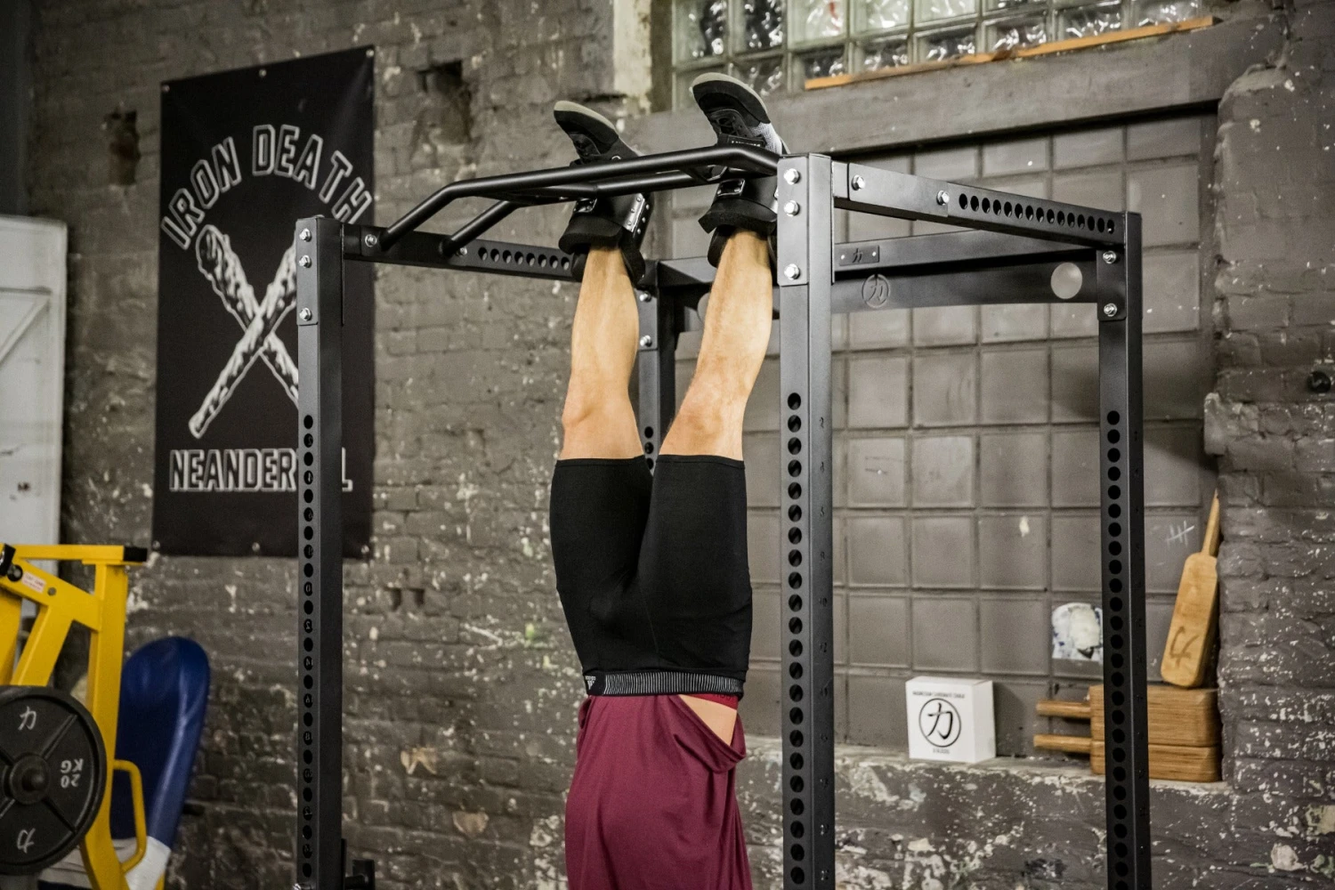 2) Maneuver the hooks on the boots onto the pull-up bar. (Tip: if you’re struggling to get the boots on the bar, you can also use the help of a resistance band to give yourself a boost)