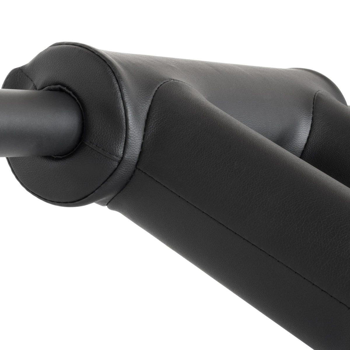 With a safety squat bar, the weight is positioned in the centre of gravity. When first using the Riot Olympic Safety Squat Bar, it may feel as if the weight is a bit in the front, but it’s actually somewhere between a back squat and front squat, in a neutral position.