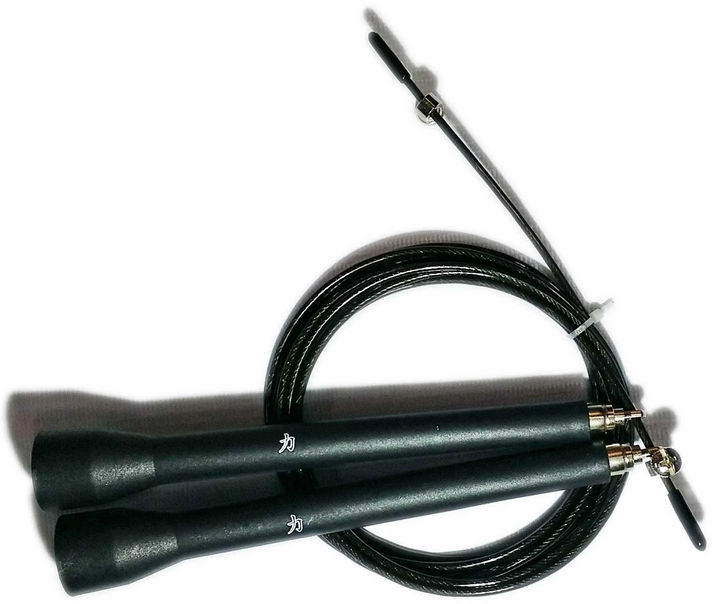 Speed/cable jump rope in black, approx 3m in length, and adjustable.